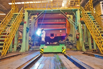中國兵器工業(yè)集團一機集團北方創(chuàng)業(yè)公司生產(chǎn)線開足馬力生產(chǎn)鐵路車輛產(chǎn)品。日前,為圓滿完成1200臺C70E(H)型通用敞車生產(chǎn)任務(wù),該公司不斷創(chuàng)新生產(chǎn)組織模式,新、舊兩條生產(chǎn)線全面啟動,白、夜班雙班組織生產(chǎn),有效保障生產(chǎn)進度。(王磊 攝) |