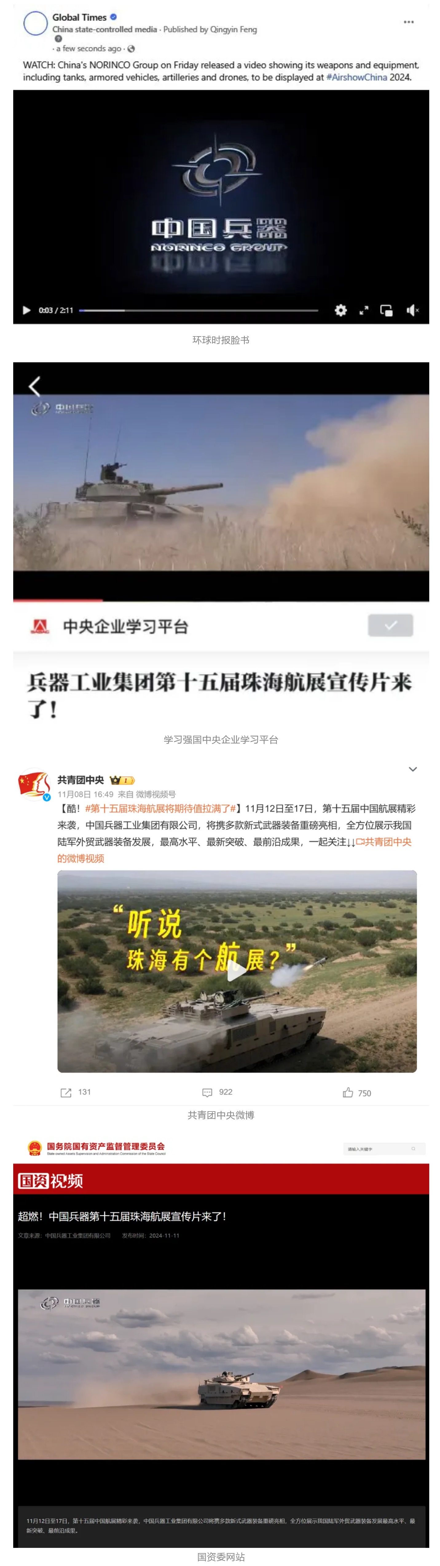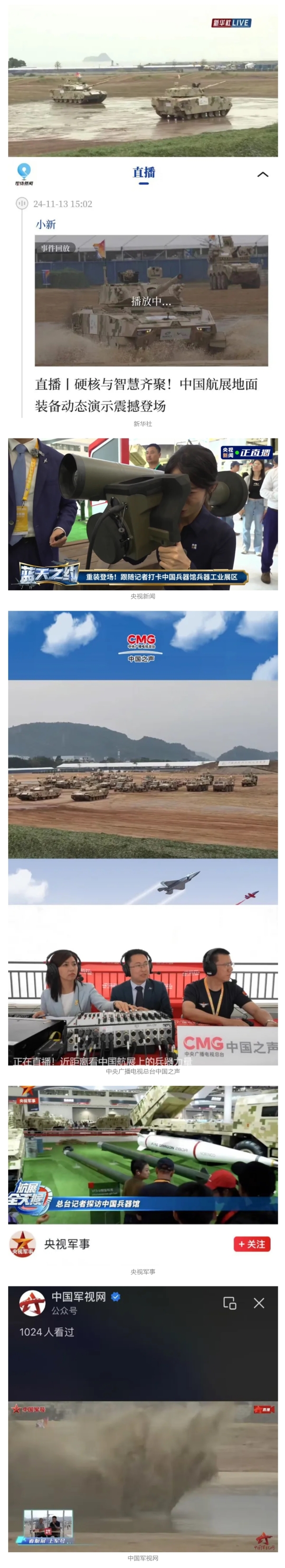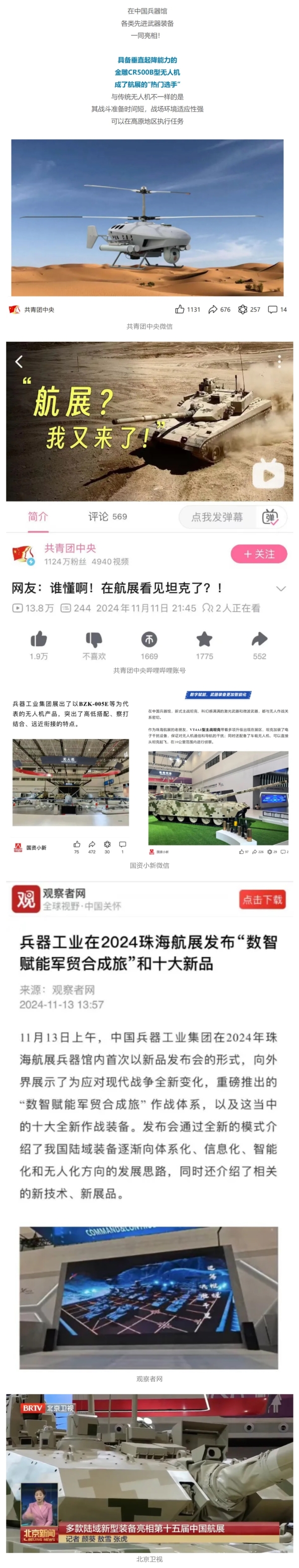 11月12日至17日,第十五屆中國(guó)國(guó)際航空航天博覽會(huì)在廣東省珠海市舉行,中國(guó)兵器工業(yè)集團(tuán)有限公司突出數(shù)智賦能軍貿(mào)合成旅作戰(zhàn)體系,帶來(lái)了一系列新產(chǎn)品、新技術(shù)、新體系,全方位展示我國(guó)陸軍外貿(mào)武器裝備發(fā)展最高水平、最新突破、最前沿成果,立體化呈現(xiàn)陸域信息化、智能化、體系化作戰(zhàn)能力,受到了全社會(huì)廣泛關(guān)注。航展期間,央視綜合頻道《新聞聯(lián)播》、央視新聞?lì)l道《新聞直播間》《長(zhǎng)空鵬程》報(bào)道兵器工業(yè)集團(tuán)參展情況,重點(diǎn)介紹了VT4A1主戰(zhàn)坦克、輪式裝甲火炮、新一代陸域指控信息系統(tǒng)、無(wú)人戰(zhàn)車、民用無(wú)人運(yùn)輸機(jī)及地面裝備演示有關(guān)內(nèi)容。央視新聞推出航展直播節(jié)目《藍(lán)天之約》,邀請(qǐng)兵器工業(yè)集團(tuán)嘉賓對(duì)參展情況、裝備動(dòng)態(tài)演示作了講解。 11月13日央視新聞《藍(lán)天之約》直播地面裝備動(dòng)態(tài)演示此次航展,央視綜合頻道《新聞聯(lián)播》《晚間新聞》、新聞?lì)l道《新聞直播間》《新聞30分》《朝聞天下》《共同關(guān)注》《東方時(shí)空》《午夜新聞》、財(cái)經(jīng)頻道《天下財(cái)經(jīng)》《經(jīng)濟(jì)信息聯(lián)播》《正點(diǎn)財(cái)經(jīng)》《第一時(shí)間》、中文國(guó)際頻道《今日環(huán)球》《中國(guó)新聞》、國(guó)防軍事頻道《軍事報(bào)道》《正午國(guó)防軍事》《國(guó)防軍事早報(bào)》《軍迷行天下》等欄目共播出兵器工業(yè)集團(tuán)參展相關(guān)新聞報(bào)道40余條。11月10日央視新聞?lì)l道《新聞30分》11月10日央視中文國(guó)際頻道《中國(guó)新聞》11月10日央視國(guó)防軍事頻道《軍事報(bào)道》11月11日央視國(guó)防軍事頻道《正午國(guó)防軍事》 人民日?qǐng)?bào)微博、新華社客戶端、央視軍事微博、中國(guó)軍號(hào)微博、央視軍事報(bào)道微博、中國(guó)日?qǐng)?bào)微博、中國(guó)新聞網(wǎng)、中國(guó)青年報(bào)-青蜂俠、環(huán)球網(wǎng)、環(huán)球時(shí)報(bào)(臉書、X平臺(tái))、學(xué)習(xí)強(qiáng)國(guó)中央企業(yè)學(xué)習(xí)平臺(tái)、共青團(tuán)中央微博、國(guó)資委網(wǎng)站等20余家中央主流媒體、國(guó)家部委的新媒體第一時(shí)間播發(fā)集團(tuán)公司航展宣傳片等視頻作品燃爆全網(wǎng),累計(jì)閱讀量突破1200萬(wàn)人次。集團(tuán)公司微信公眾號(hào)、微博、抖音號(hào)、快手號(hào)、微信視頻號(hào)、知乎號(hào)等新媒體宣傳片播放閱讀量近1000萬(wàn)人次,點(diǎn)贊近20萬(wàn)人次。 新華社、央視新聞、中央廣播電視總臺(tái)中國(guó)之聲、央視軍事、中國(guó)軍視網(wǎng)、廣東廣播電視臺(tái)等媒體以及國(guó)家國(guó)防科工局、國(guó)資小新等到兵器工業(yè)集團(tuán)地面動(dòng)態(tài)演示區(qū)、中國(guó)兵器館進(jìn)行了直播。 廣東廣播電視臺(tái)新華社、人民網(wǎng)、央視新聞、中央廣播電視總臺(tái)中國(guó)之聲、解放軍報(bào)、中國(guó)日?qǐng)?bào)網(wǎng)、中國(guó)科技網(wǎng)、中國(guó)新聞網(wǎng)、環(huán)球時(shí)報(bào)(中文版、英文版)、環(huán)球網(wǎng)、學(xué)習(xí)強(qiáng)國(guó)中央企業(yè)學(xué)習(xí)平臺(tái)、共青團(tuán)中央、國(guó)資小新新媒體、觀察者網(wǎng)、搜狐網(wǎng)、新浪網(wǎng)、騰訊網(wǎng)、鳳凰網(wǎng)等中央主流媒體和知名網(wǎng)絡(luò)媒體以及北京衛(wèi)視、北京日?qǐng)?bào)、北京晚報(bào)、新京報(bào)、廣東電視臺(tái)、南方plus等省市媒體對(duì)集團(tuán)公司參展情況進(jìn)行了圖片、文字、音頻、視頻報(bào)道。 來(lái)源/各中央主流媒體、地方媒體 |
