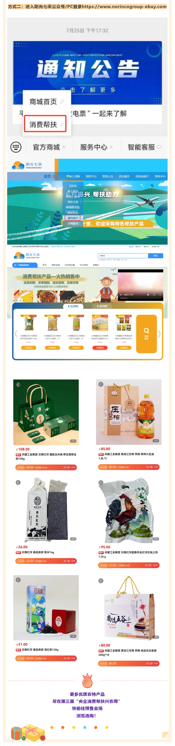 百家央企聚合力 消費(fèi)幫扶促振興 第三屆“央企消費(fèi)幫扶興農(nóng)周” 預(yù)售已啟動(dòng) 8月30日 興農(nóng)周活動(dòng)將正式開(kāi)啟 “央企消費(fèi)幫扶興農(nóng)周”由國(guó)務(wù)院國(guó)資委社會(huì)責(zé)任局指導(dǎo),央企消費(fèi)幫扶電商平臺(tái)(國(guó)網(wǎng)數(shù)字科技控股有限公司)主辦,國(guó)務(wù)院國(guó)資委機(jī)關(guān)服務(wù)管理局、國(guó)務(wù)院國(guó)資委新聞中心、國(guó)網(wǎng)北京市電力公司、各中央企業(yè)電商平臺(tái)聯(lián)合協(xié)辦。 活動(dòng)以“央企攜手,興農(nóng)惠民”為主題,組織動(dòng)員中央企業(yè)所屬各單位各部門(特別是工會(huì)、食堂)、廣大干部職工、上下游供應(yīng)商和業(yè)務(wù)合作伙伴采購(gòu)幫扶縣的優(yōu)質(zhì)農(nóng)產(chǎn)品,促進(jìn)脫貧地區(qū)產(chǎn)業(yè)發(fā)展和脫貧群眾穩(wěn)定增收,鞏固拓展脫貧攻堅(jiān)成果。 預(yù)售活動(dòng)火熱開(kāi)啟 為方便大家提前選購(gòu) 此次預(yù)售期升級(jí)為10天 (8月20日-8月29日) 誠(chéng)邀下單 兵器工業(yè)集團(tuán)定點(diǎn)幫扶 黑龍江甘南縣、云南紅河縣 農(nóng)特產(chǎn)品! 8月30日-9月5日 請(qǐng)鎖定“央企館-兵器工業(yè)集團(tuán)” 我們一起共譜鄉(xiāng)村振興新篇章! |