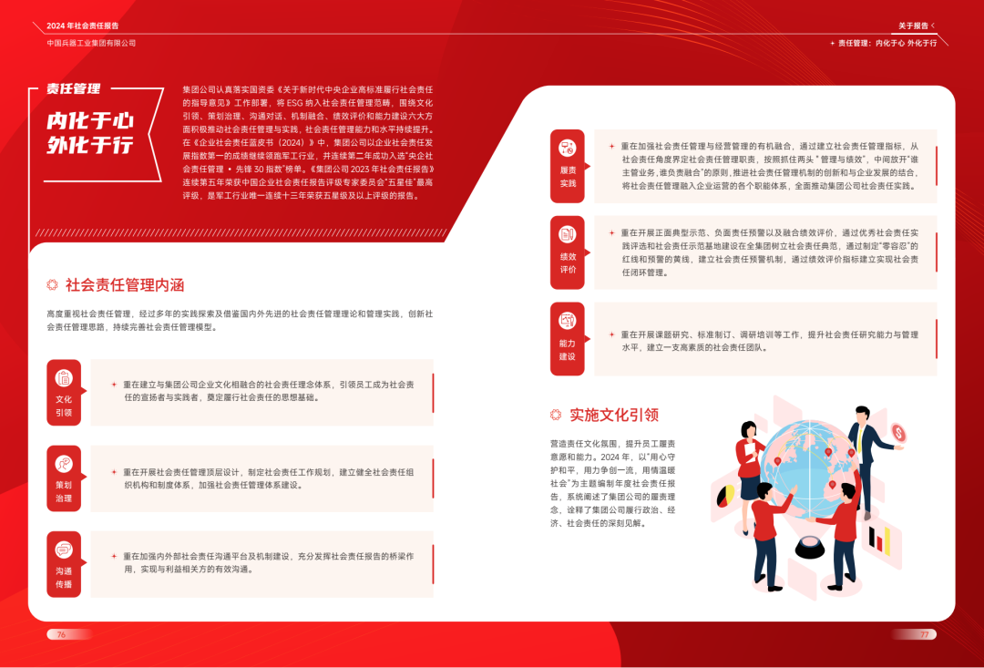 近日,中國(guó)兵器工業(yè)集團(tuán)有限公司正式發(fā)布《中國(guó)兵器工業(yè)集團(tuán)有限公司2024年度社會(huì)責(zé)任報(bào)告》。本次報(bào)告是集團(tuán)公司第16份年度社會(huì)責(zé)任報(bào)告,從堅(jiān)守強(qiáng)軍首責(zé)、服務(wù)經(jīng)濟(jì)建設(shè)、共創(chuàng)美好生活三個(gè)維度,全面展示集團(tuán)公司履行社會(huì)責(zé)任的實(shí)踐與成效。經(jīng)中國(guó)企業(yè)社會(huì)責(zé)任報(bào)告評(píng)級(jí)專家委員會(huì)評(píng)定,《報(bào)告》獲得“五星佳”最高評(píng)級(jí),成為軍工行業(yè)唯一一家連續(xù)6年獲此殊榮的中央企業(yè)。 兵器工業(yè)集團(tuán)2024年度社會(huì)責(zé)任報(bào)告 部分內(nèi)容摘錄 ↓↓↓ 文/社會(huì)責(zé)任部 |